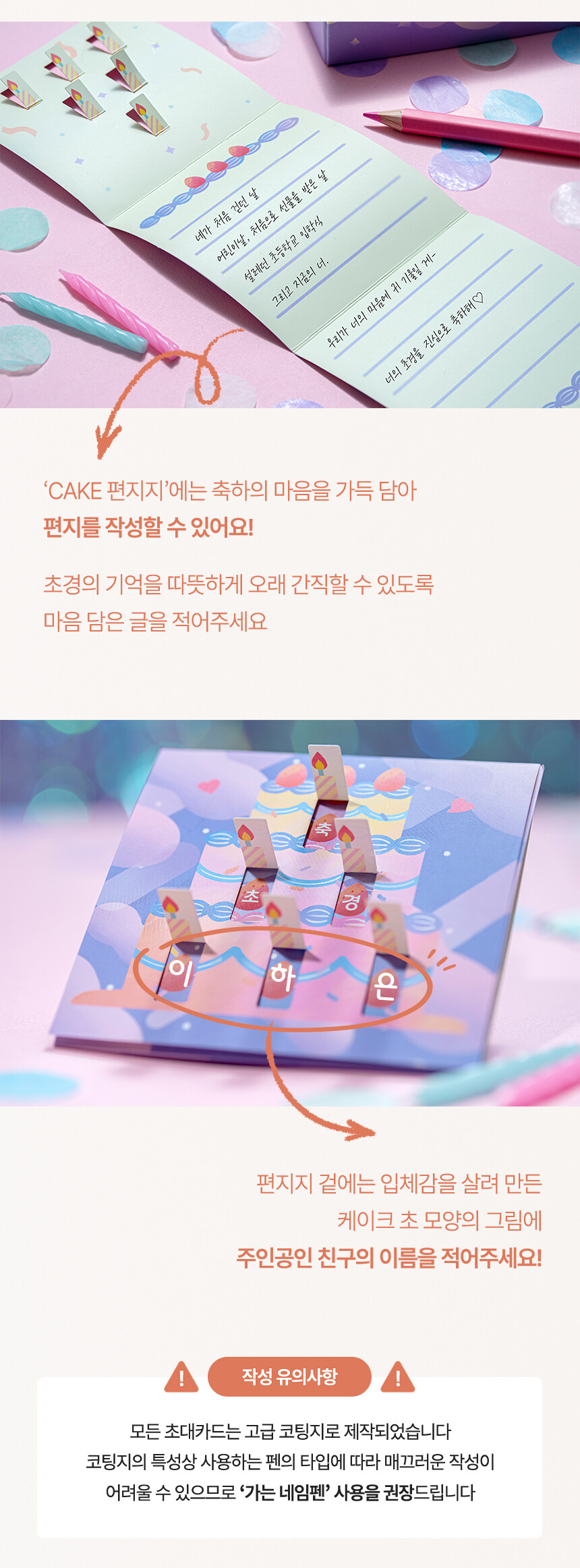 1. 초대카드 내부에 편지 작성란이 있습니다. 초대 CAKE 편지지를 열어 작성 후 본래 자리로 삽입을 부탁드립니다.