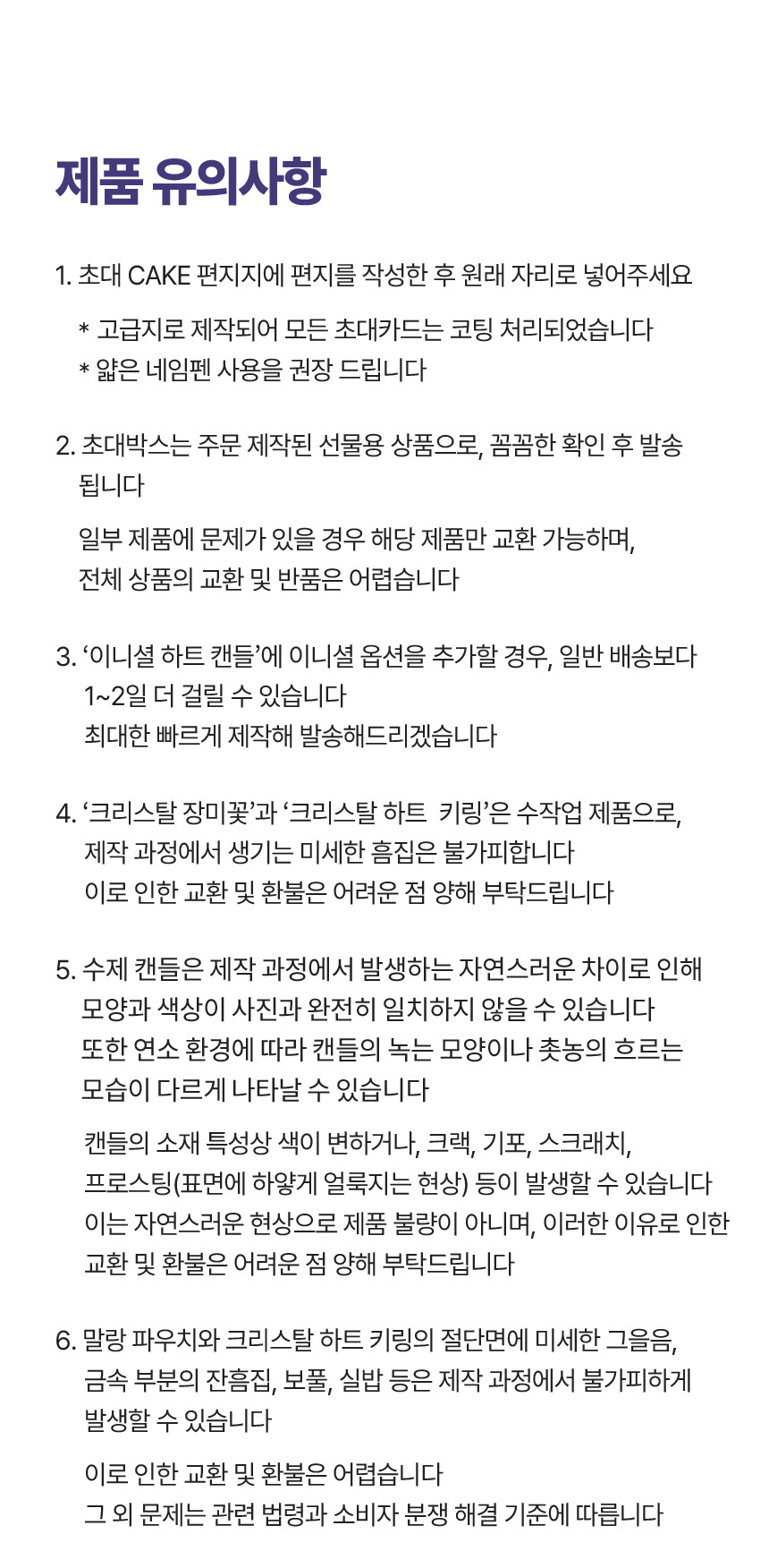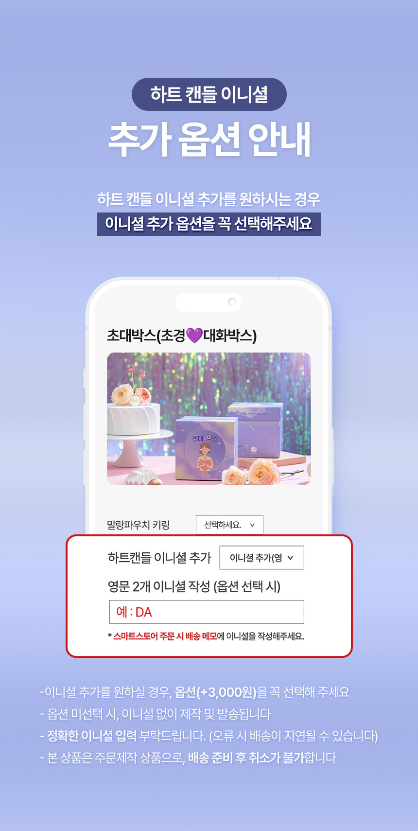 3. '케이크캔들' 이니셜 옵션 추가 시 일반 배송일보다 1-2일이 더 소요될 수 있습니다.