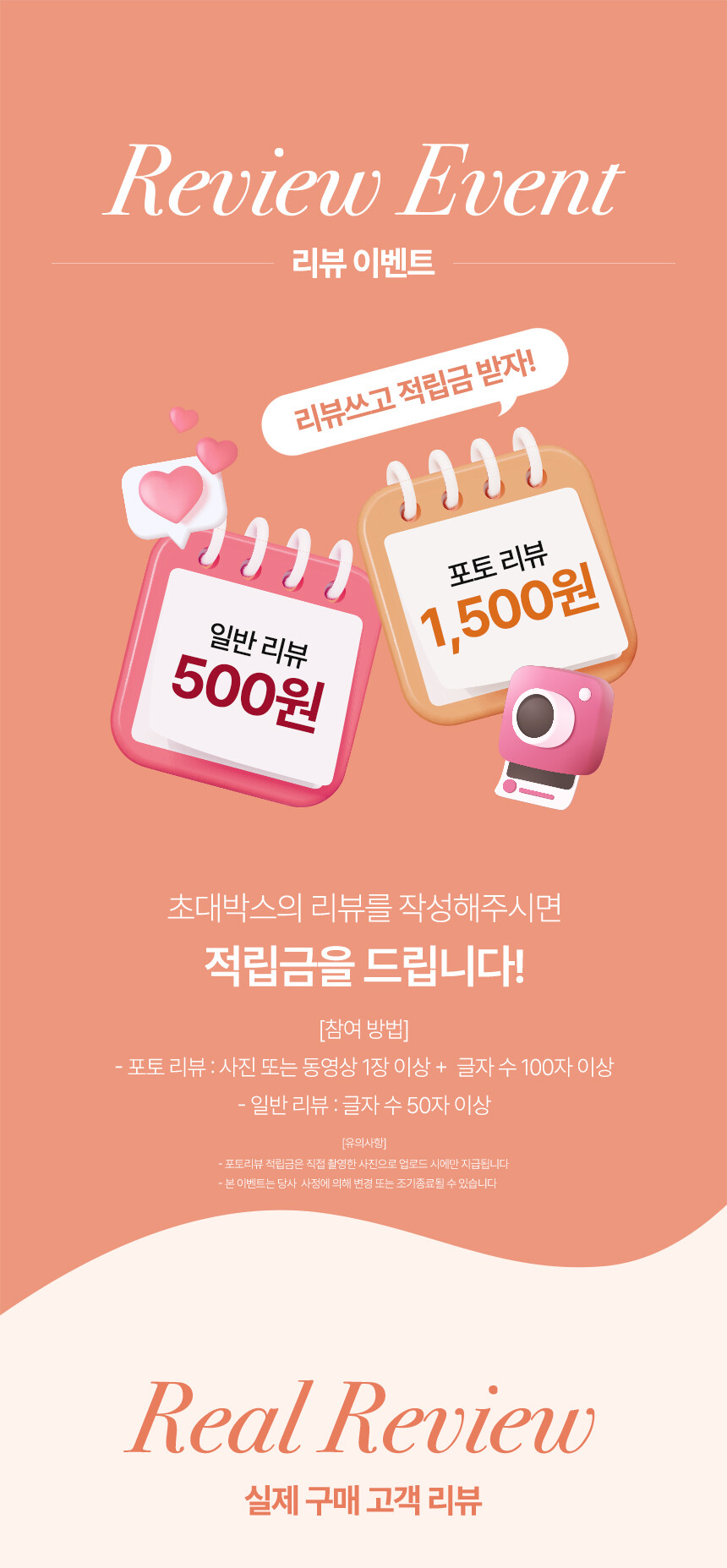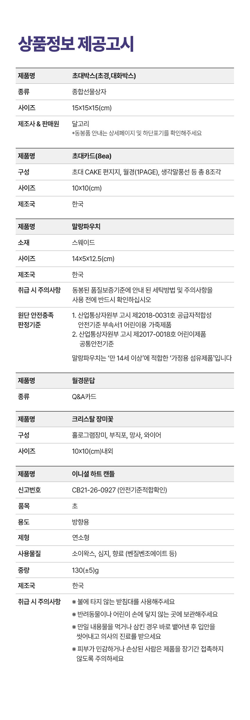 2. 초대박스는 선물용 주문 제작 상품입니다. 충분히 꼼꼼한 확인과 선별작업을 거치며 일부 상품의 문제 발생 시 '문제가 발생한 해당 제품'을 확인 후 새 제품으로 교환 가능하며 이로 인한 초대박스 '전체상품'의 교환·반품은 어렵습니다.