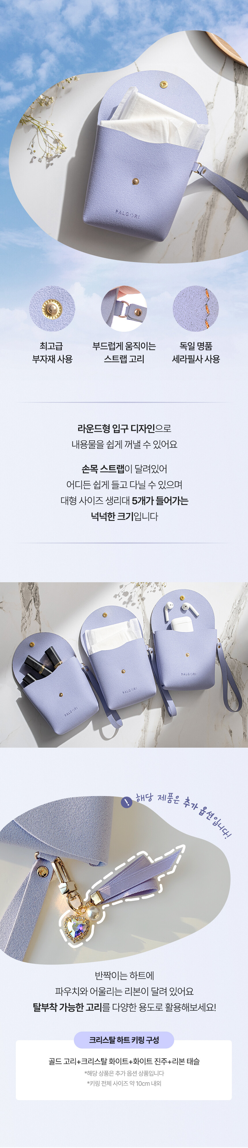6.말랑파우치, 크리스탈 하트 키링 절단면의 미세한 그을음, 버튼 등 금속 부분의 잔흠집, 미세한 보풀, 실밥 등은 제작 과정에서 불가피하게 발생하는 부분입니다. 때문에 이로 인한 무상교환, 환불이 어렵습니다. 이외의 부분은 관련 법 및 소비자 분쟁 해결 기준에 따릅니다.
